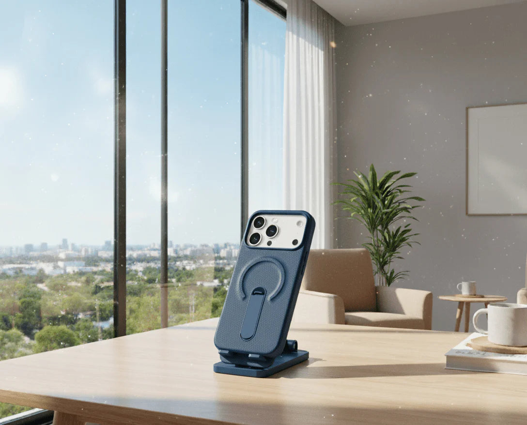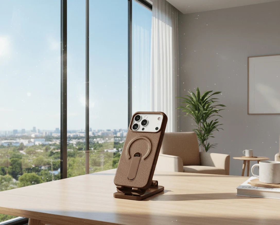 Crafted from high-quality leather, it feels soft in your hand while giving your phone a firm grip. The built-in MagSafe compatibility ensures fast, secure wireless charging without removing the case. The metal ring kickstand adds extra comfort, allowing you to watch videos, take calls, or browse hands-free.
